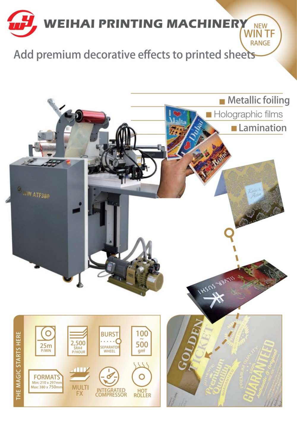 เครื่องเคลือบและเคลือบฟอยล์แบบป้อนแผ่นขนาด 380 มม. ผลิตโดย Weihai Printing Machinery Co., Ltd. มีฟังก์ชันการเคลือบอัตโนมัติและปั๊มร้อน ส่วนใหญ่จะใช้สำหรับผลิตภัณฑ์พิมพ์ดิจิทัล แต่ยังสามารถเคลือบและพิมพ์ออฟเซตแสตมป์ร้อนได้โดยอัตโนมัติ เป็นเครื่องกดเคลือบและฟอยล์อัตโนมัติแบบไม่ใช้แผ่นที่ดีเยี่ยม