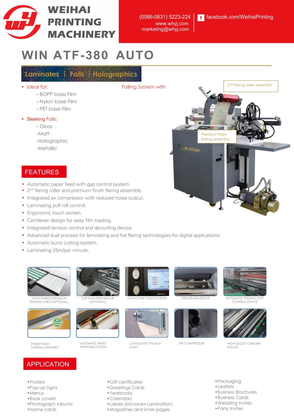 เครื่องเคลือบและเคลือบฟอยล์ฟีดอัตโนมัติที่ผลิตโดย Weihai Printing Machinery Co., Ltd. มีฟังก์ชันการเคลือบอัตโนมัติและปั๊มร้อน ส่วนใหญ่จะใช้สำหรับผลิตภัณฑ์พิมพ์ดิจิทัล แต่ยังสามารถเคลือบและพิมพ์ออฟเซตแสตมป์ร้อนได้โดยอัตโนมัติ เป็นเครื่องกดเคลือบและฟอยล์อัตโนมัติแบบไม่ใช้แผ่นที่ดีเยี่ยม