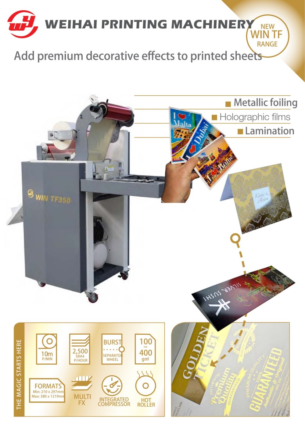 ออกแบบและผลิตโดย Weihai Printing Machinery Co., Ltd. เครื่องเคลือบและฟอยล์แบบไม่ใช้เพลทเป็นเครื่องเคลือบกระดาษและเคลือบฟอยล์โลหะแบบป้อนกระดาษด้วยตนเอง การออกแบบที่กะทัดรัดช่วยประหยัดพื้นที่ในขณะที่บรรจุในฟังก์ชันทั้งการเคลือบและการฟอยล์โลหะ เหมาะสำหรับธุรกิจที่ต้องการเพิ่มการตกแต่งภายในองค์กร เปลี่ยนวัสดุพิมพ์ธรรมดาให้เป็นผลิตภัณฑ์สำเร็จรูปที่สวยงาม ทำงานได้อย่างราบรื่นกับทั้งการใช้งานแบบดิจิทัลตามต้องการและการพิมพ์ออฟเซตการพิมพ์หินแบบดั้งเดิม เพื่อให้ได้ผลลัพธ์ที่ดีที่สุด อุปกรณ์นี้มีอุปกรณ์ควบคุมอิเล็กทรอนิกส์ที่ปรับแรงดันลูกกลิ้งและอุณหภูมิความร้อนระหว่างการทำงาน การปรับเปลี่ยนเหล่านี้ขึ้นอยู่กับปัจจัยต่างๆ เช่น ความเร็วในการทำงาน ความหนาของกระดาษ และรูปแบบการออกแบบ เครื่องจักรนี้ได้พิสูจน์ตัวเองแล้วว่าเป็นเครื่องมือปั๊มร้อนและเคลือบลามิเนตคุณภาพสูงที่ไม่ต้องผลิตเพลท ช่วยให้ลูกค้าเพิ่มมูลค่าที่สำคัญให้กับผลิตภัณฑ์ของตนได้ ลูกค้ายังมีฟิล์มลามิเนตและฟอยล์โลหะให้เลือกมากมาย จึงสามารถตอบสนองทุกความต้องการในการตกแต่ง นอกจากนี้ยังมีโต๊ะป้อนกระดาษแบบขยายได้ เหมาะสำหรับแบนเนอร์และวัสดุพิมพ์ที่ยาวเป็นพิเศษ